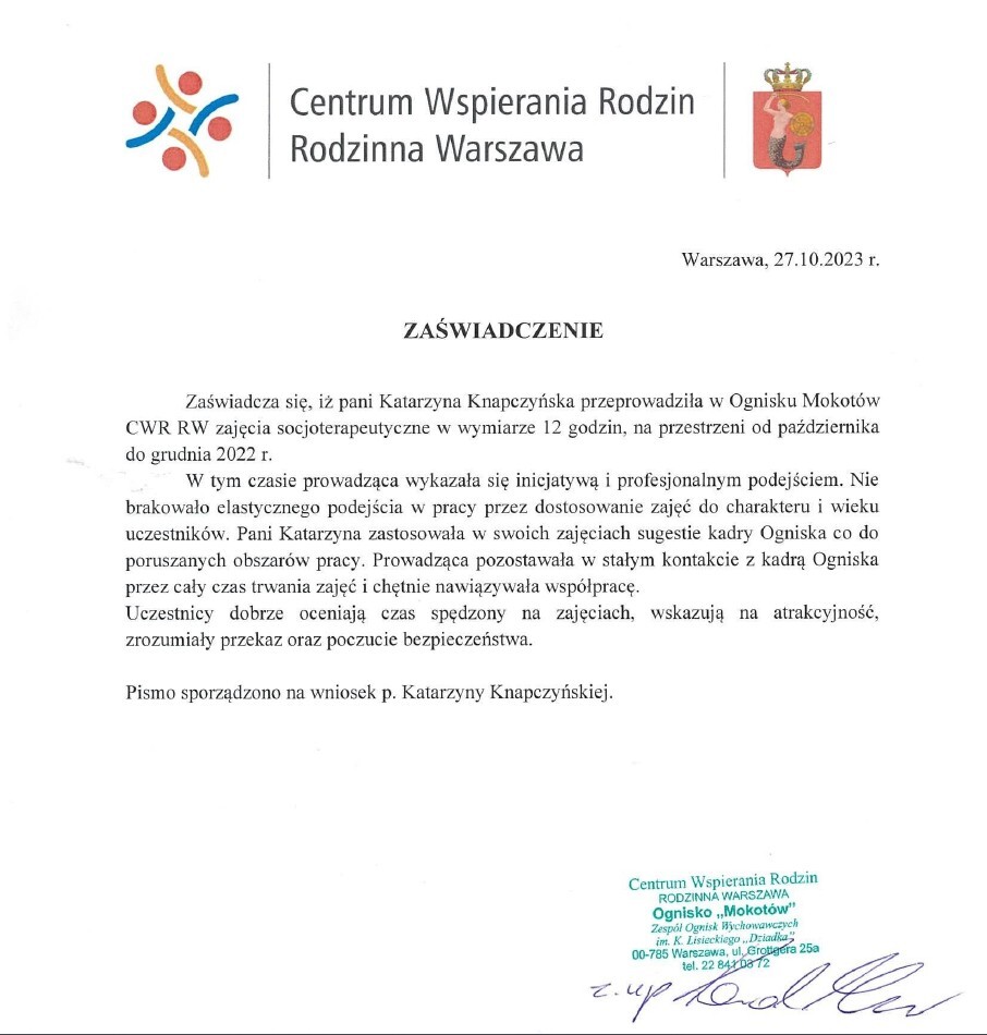 Ukończyłam również kierunek socjoterapia oraz uzyskałam tytuł trenera Treningu Umiejętności Społecznych (TUS).